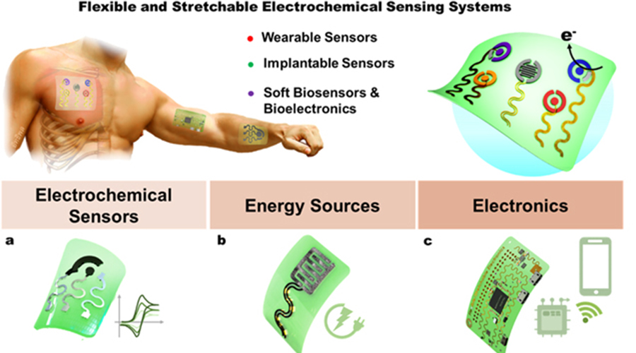 通過柔性生物傳感器可連續獲取溫度、壓力、應力等物理信號來實現對人體活動情況,如心率、血壓、腦電圖、心電圖等,但連續監測人體體液、呼出氣中的各類化學物質的可穿戴傳感器仍面臨許多問題,比如傳感器的柔韌性、靈敏度、準確性以及與人體皮膚的貼合性等。